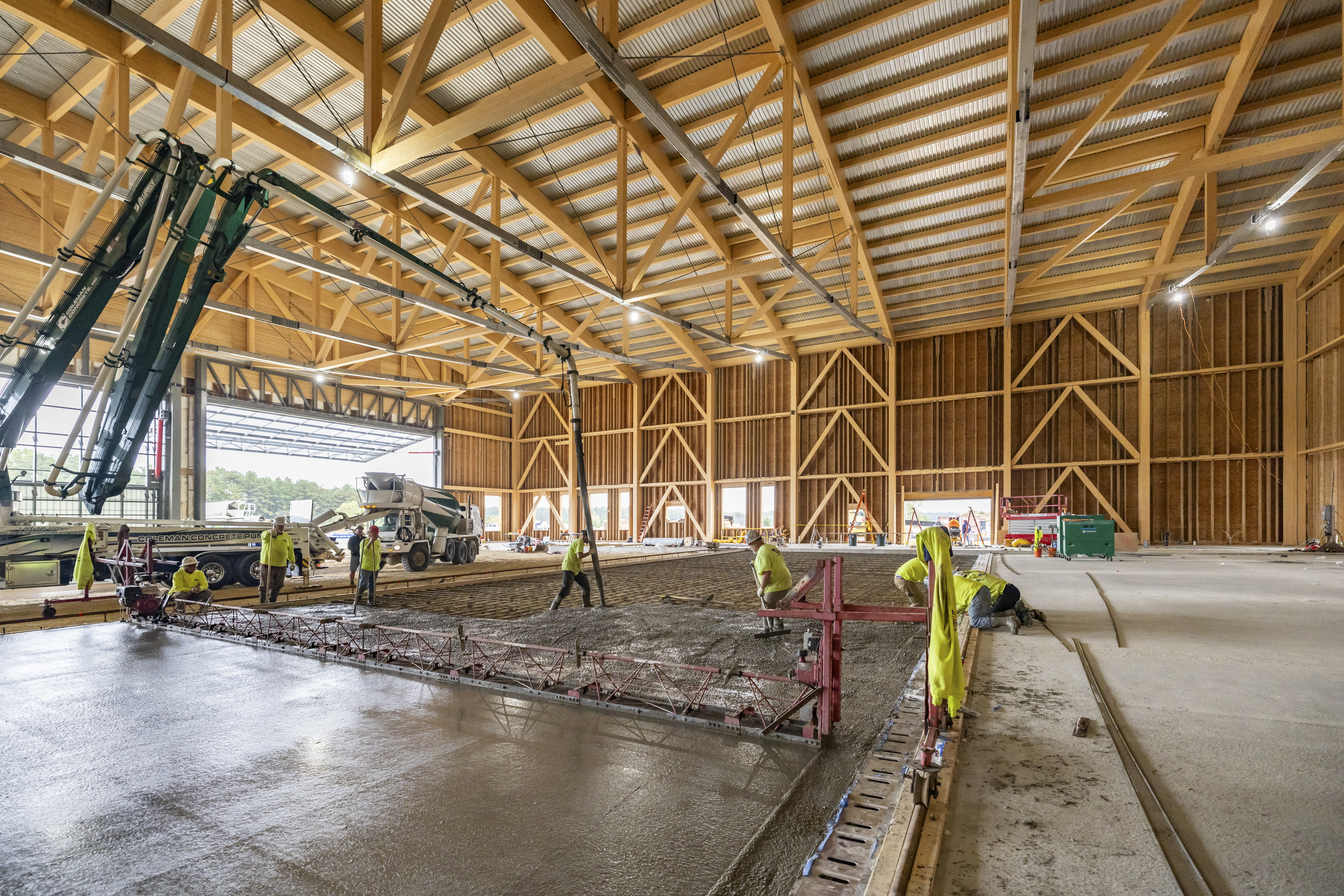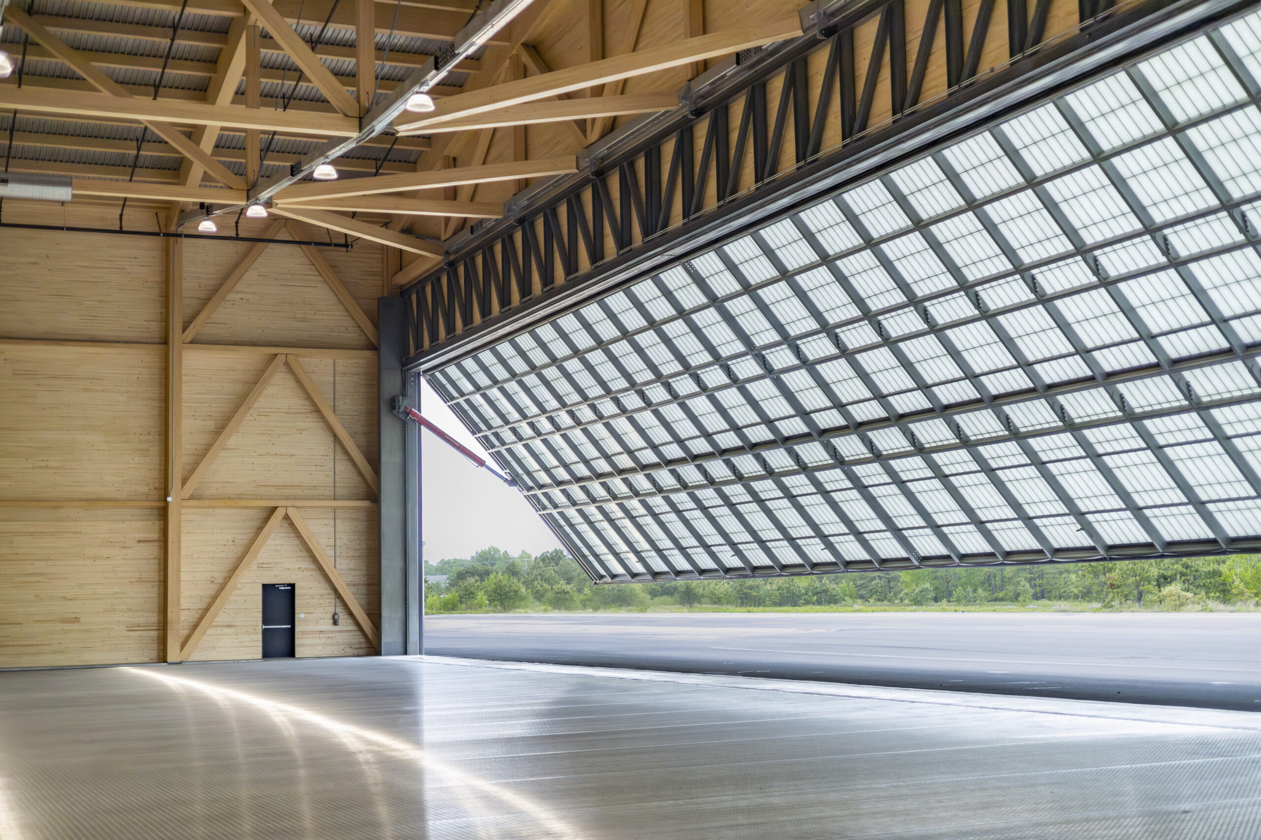 Brought on as the Engineer of Record (EOR), Artisan Engineering provided general design oversight of the wood framing as well as full foundation design for this corporate hanger. Working together with Silver Maple Construction as the General Contractor and Art Massif as the Mass Timber Consultant, the results produced North American’s first net-zero corporate airplane hangar. This approximately 36,000 sf hangar boasts 42ft tall glulam columns supporting 210ft clear span by 30ft deep trusses. Each truss is composed of curved glulam top chords and tube-steel bottom cords. Each truss weighed approximately 50,000 lbs. Glulam chevron braces make up the lateral force resisting system. Two free standing, cantilevered doors provide aircraft access. The larger of which weighs approximately 60,000 lbs and is 120ft x 30ft; the largest freestanding cantilever door that the manufacturer had produced at the time. Another unique feature is the integration of the first code-compliant private building to use Safespill, a fire-suppression system that removes spilled jet fuel into trenches instead of using fire-fighting foam.